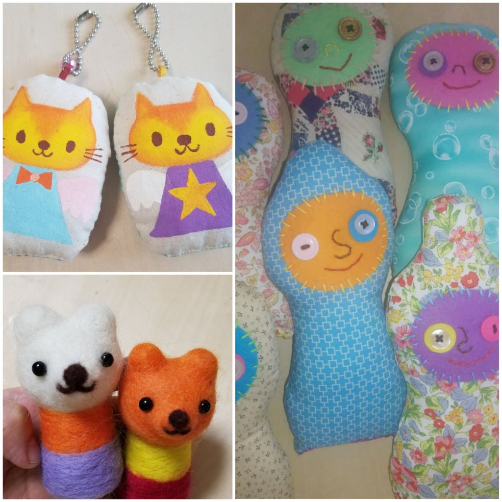 オリジナル人形「ぶーにー」や羊毛フェルト人形など様々な手芸作品たち。