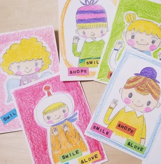 ポストカードサイズの画用紙に色鉛筆で描いたドローイング。
